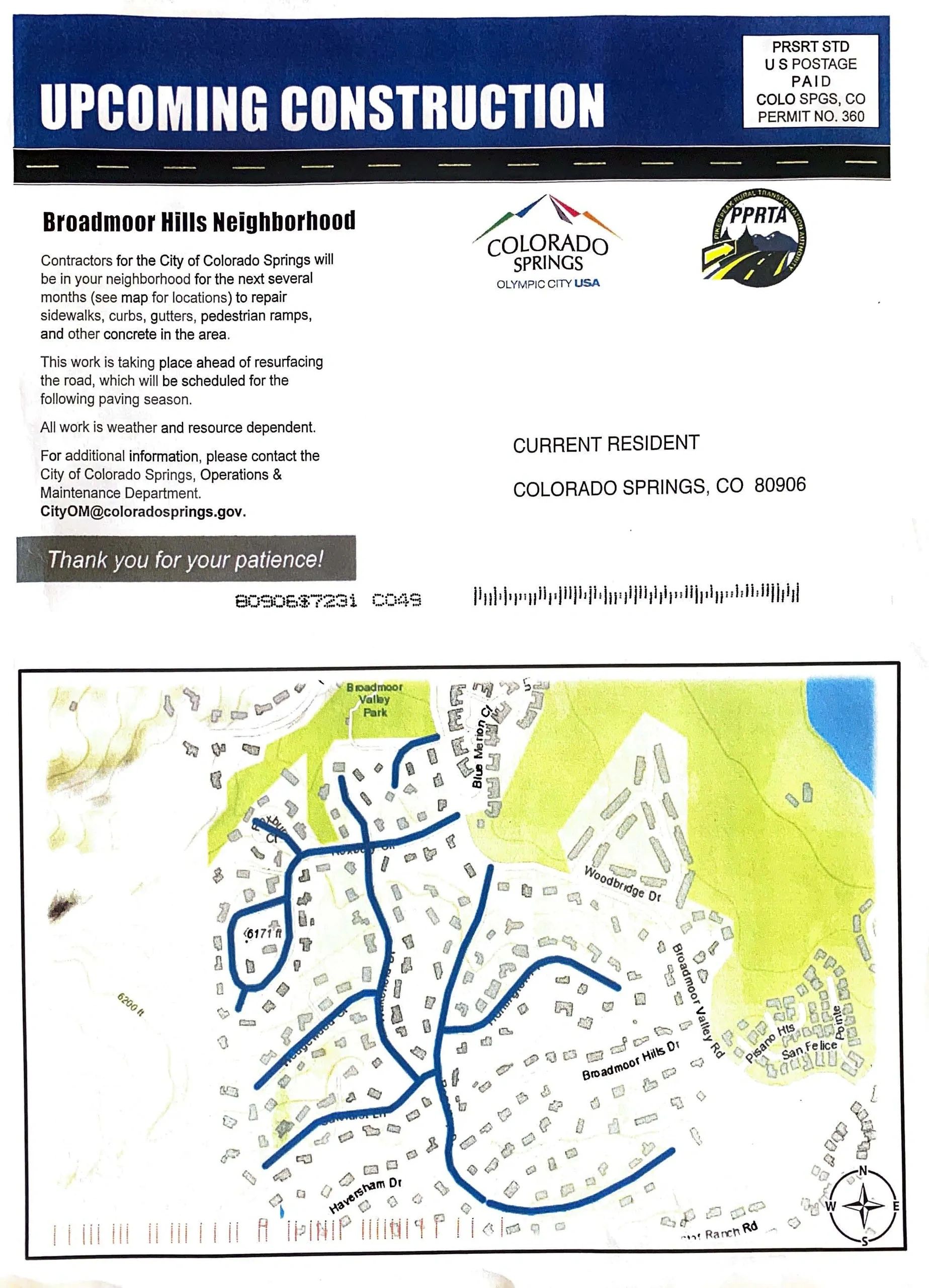 We are excited to see the concrete and paving improvements that began in May 2021 being done to our sidewalks, curbs, gutters and streets throughout the neighborhood by the City of Colorado Springs Public Works Department and their contractors Lucky Dog and Schmidt Construction have been completed. (Broadmoor Valley Road and Regency Drive will be completed with the 2C2 program once Colorado Springs Utilities completes the water main replacement project on Regency.) The HOA has worked tirelessly since 2019 on this critical neighborhood infrastructure project and we hope you enjoy and appreciate the transformation of our deteriorated sidewalks, curbs and crumbling streets as you walk and drive through our neighborhood.
